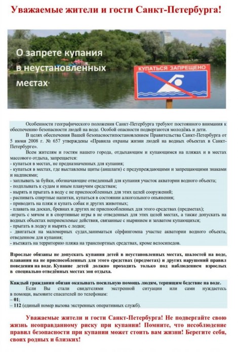 Памятка родителям по запрету купания в неотведенных местах