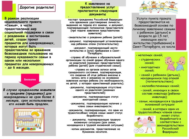 Услуги пункта проката предоставляются на безвозмездной основе на срок до 6 месяцев семьям с ребенком (детьми) в возрасте до 2 лет, имеющим место жительства (место пребывания) в Санкт-Петербурге.