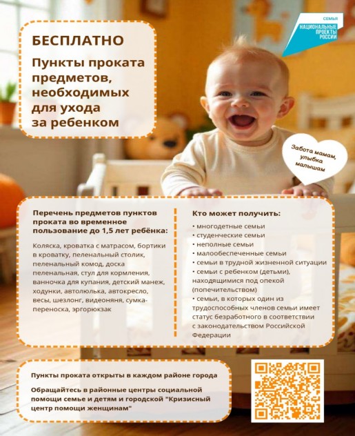 Перечень предметов первой необходимости для новорожденных состоит из 37 предметов. Подробную информацию о работе Пункта проката и наличии предметов можно получить по телефону: 8-931-326-49-33 и по ссылке: https://share.google/ZMLLKXcRhkfSIV7uM