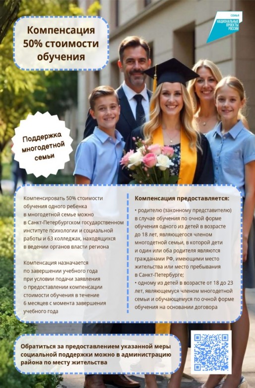 2. Компенсация 50 % стоимости обучения одного из детей из многодетной семьи,обучающегося по очной форме обучения в средних профессиональных образовательных учреждениях (колледжах) и высших образовательных учреждениях (институтах), которые находятся в ведении исполнительных органов государственной власти Санкт-Петербурга.